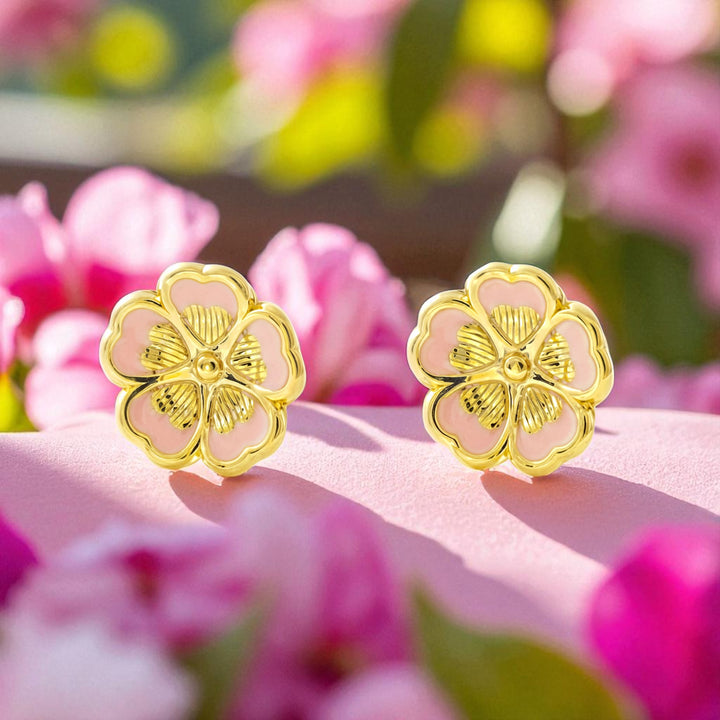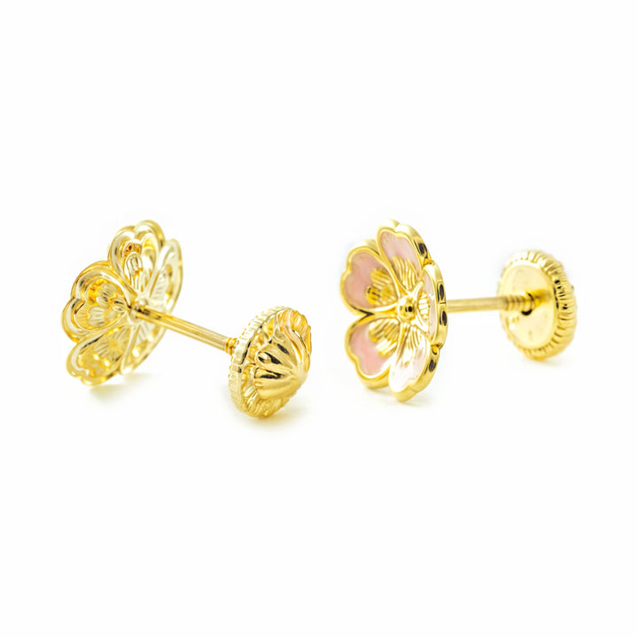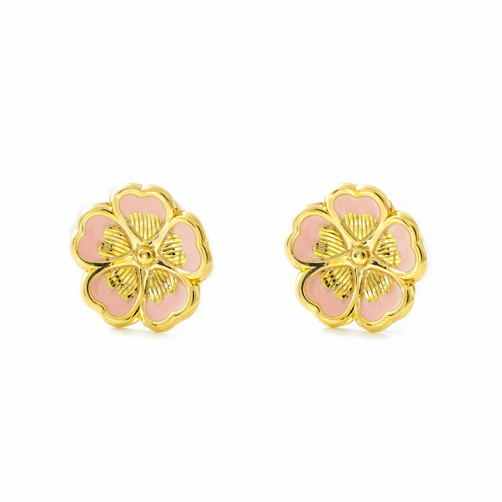 Damen & Kinder Ohrringe Gelbgold 9K Blume Emaille Rosa Glanz und Textur