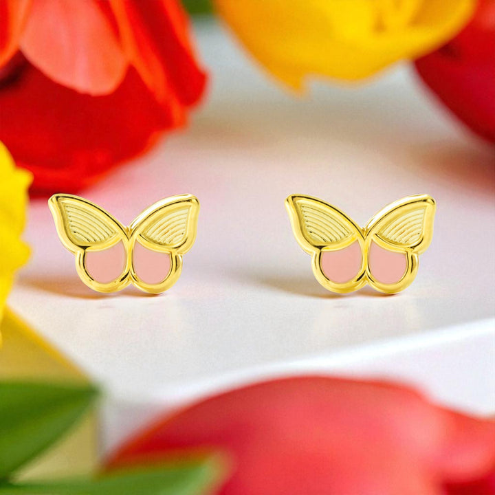 Damen & Kinder Ohrringe Gelbgold 9K Schmetterling Emaille Rosa Glanz und Textur
