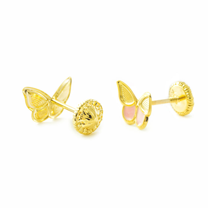 Pendientes Niña Mujer oro Amarillo 9K Mariposa Esmalte Rosa Brillo y Textura
