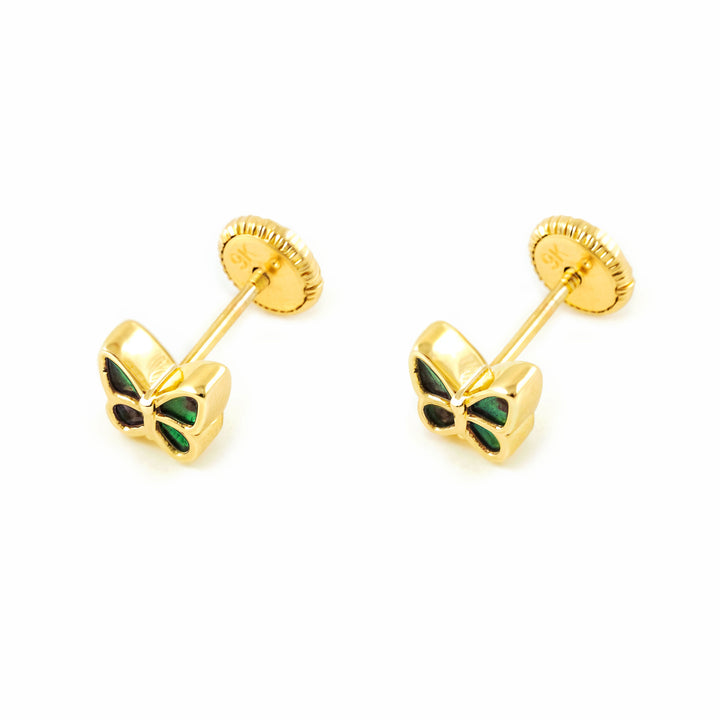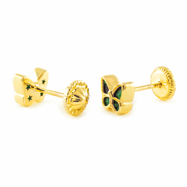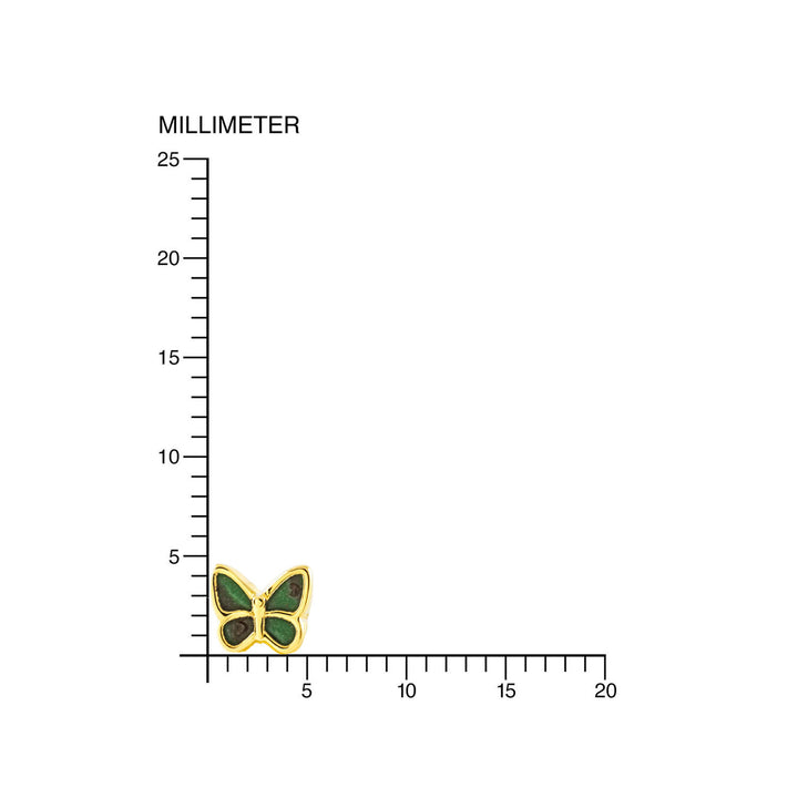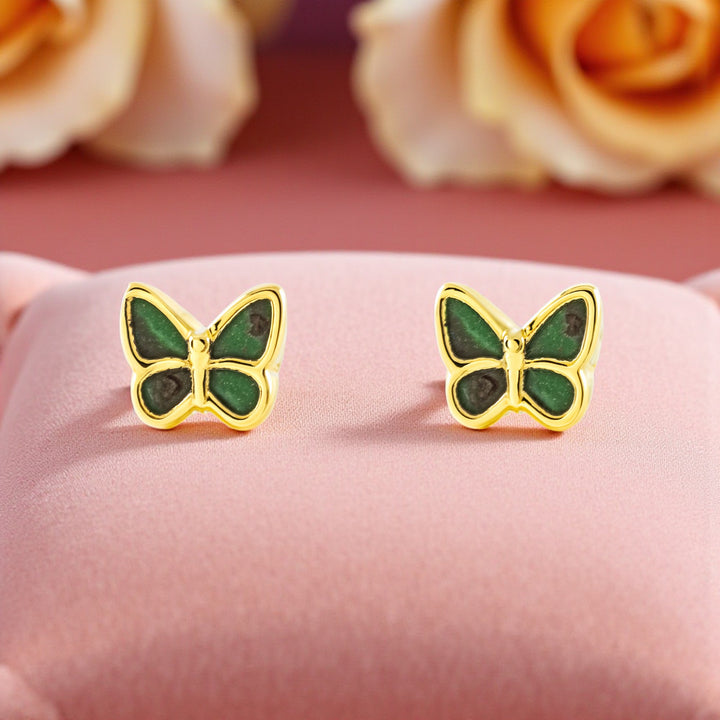 Entdecken Sie die Zartheit und den Charme der Mädchenohrringe aus 9K Gelbgold, die in Form eines Schmetterlings gestaltet und mit grünem Malachit verziert sind. Ihr glänzendes Finish verleiht einen Hauch von Licht und Raffinesse, ideal, um jeden Kinderlook mit Eleganz und Farbe zu ergänzen.
